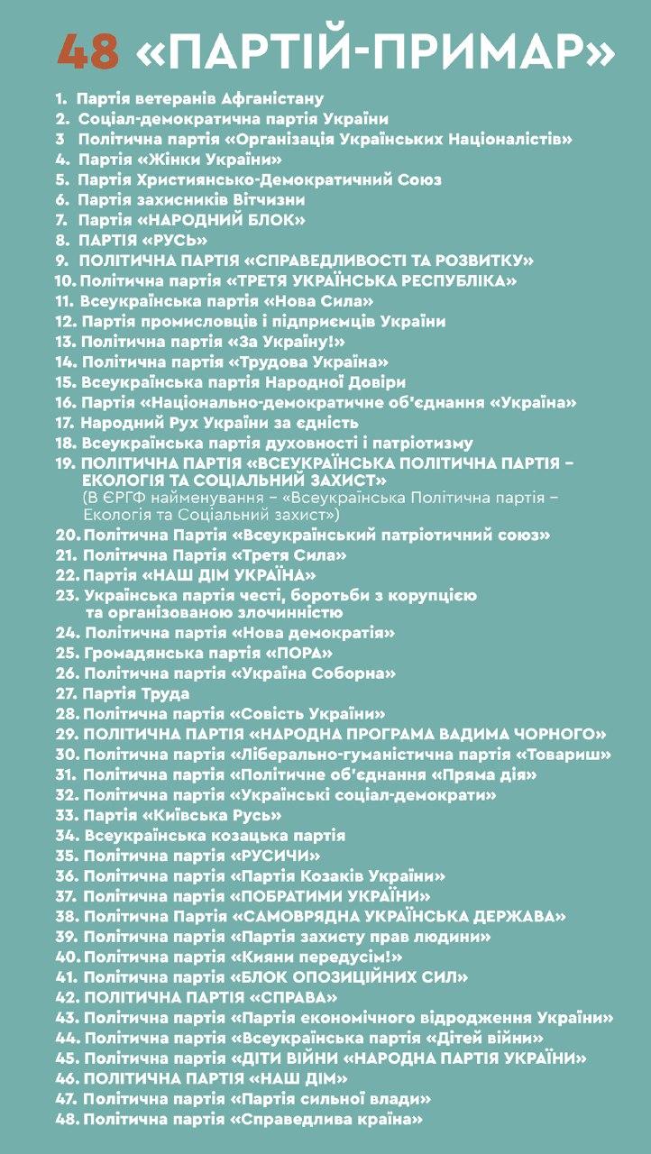 Також Мінюст опублікував список "партій-примар", стосовно яких будуть висуватися позовні вимоги про анулювання реєстрації.