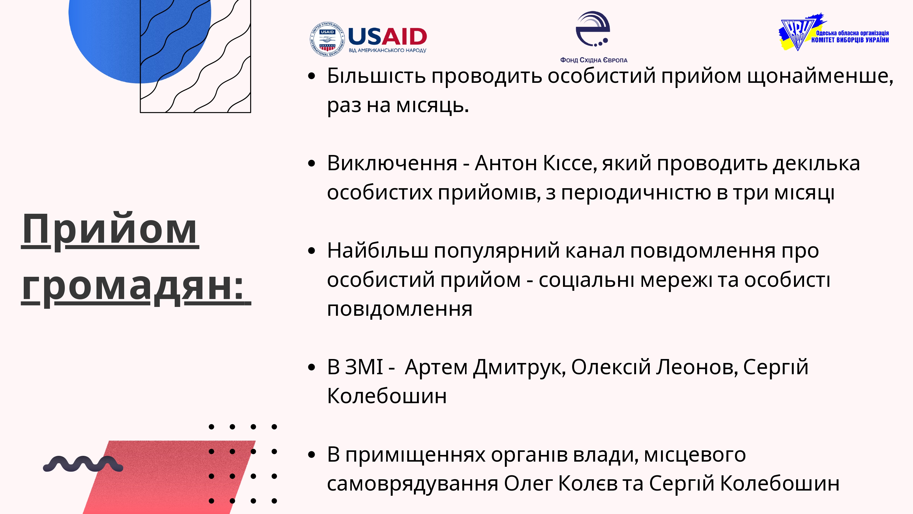 У рамках проєкту «Інформована взаємодія жителів та народних депутатів Одеської області» Одеська обласна організація ВГО «Комітет виборців України» провела низку моніторингів матеріалів про підходи, які використовуються для взаємодії з громадянами щодо проблем виборчого округу всіх 11 народних депутатів, обраних на мажоритарних округах Одеси та області, а також народних депутатів, закріплених за Одеською областю парламентськими фракціями.