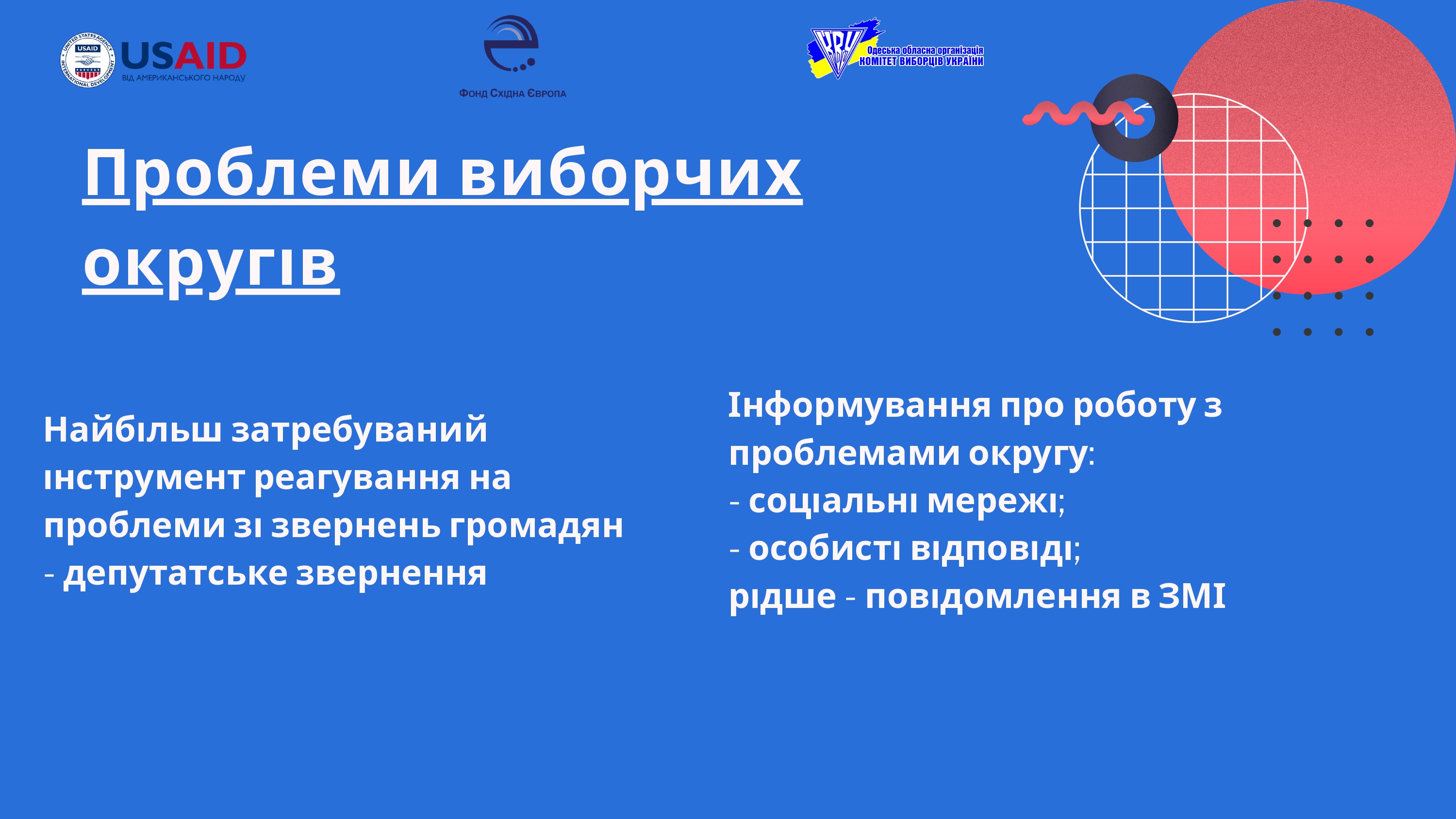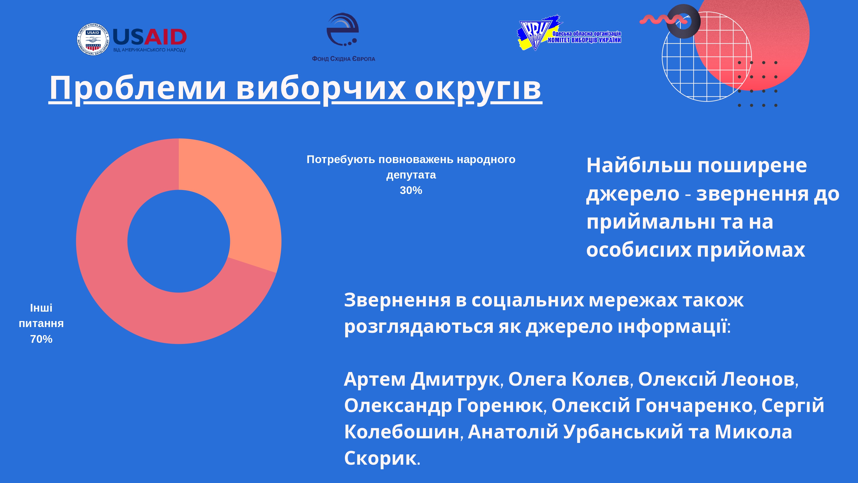 Найбільшим джерелом, з якого народні депутати отримують інформацію про проблеми виборчих округів є звернення від громадян. При цьому кількість звернень від громадян до народних депутатів, які свідчать про системні проблеми виборчого округу і потребують втручання народного депутата, складає не більше 20-30%.