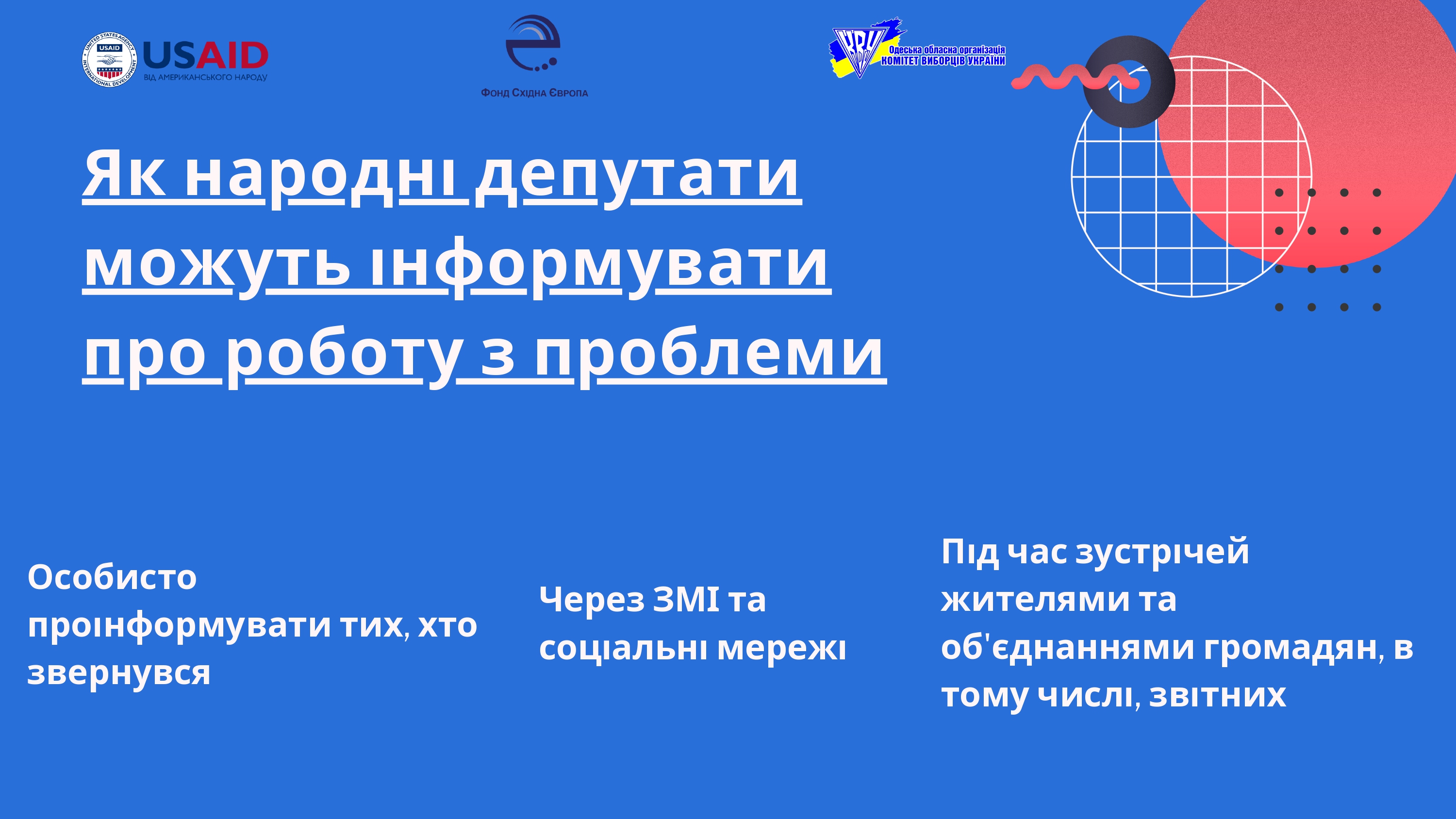 Для інформування громадян про свою роботу над вирішенням проблем виборчих округів, а також проблем, отриманих зі звернень громадян, народні депутати найчастіше використовують соціальні мережі та безпосередні зустрічі із громадянами.