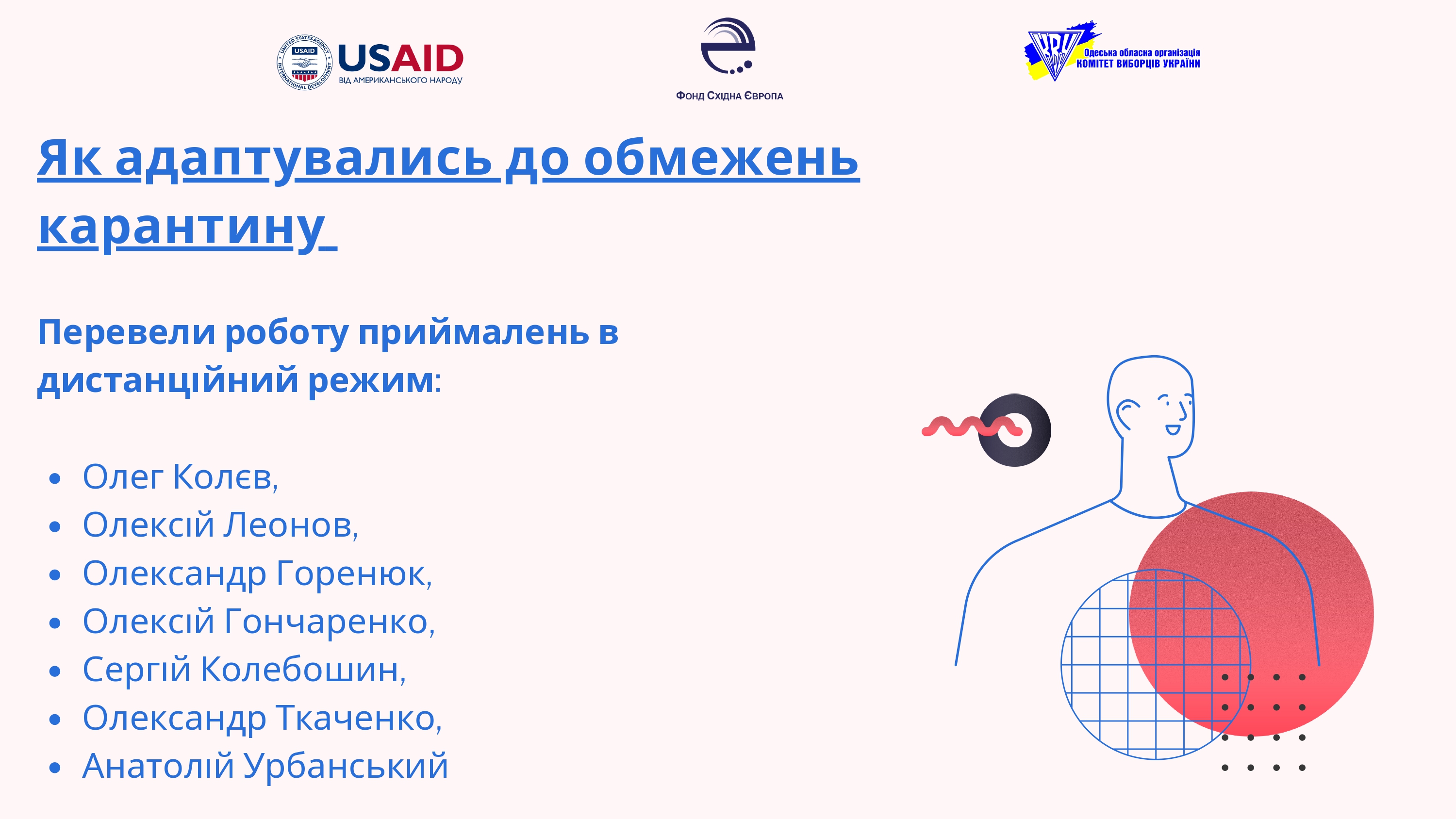 У березні через ці обмеження Олег Колєв, Олексій Леонов, Олександр Горенюк, Олексій Гончаренко, Сергій Колебошин, Олександр Ткаченко, Анатолій Урбанський та Микола Скорик перевели роботу своїх приймалень на дистанційний режим.
