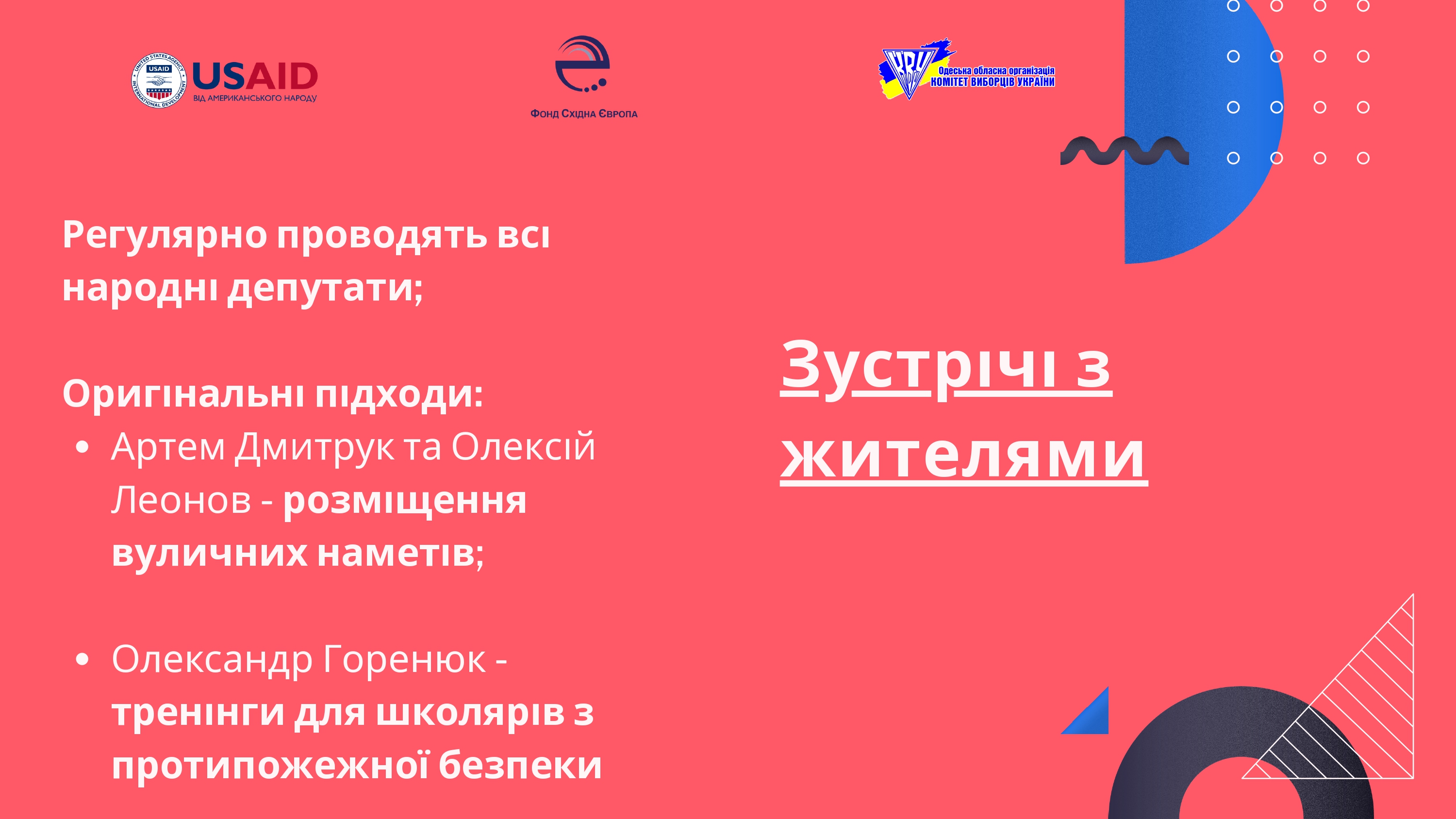 Народні депутати регулярно здійснюють неформальні зустрічі з громадянами, на яких обговорюються проблеми виборчого округу.