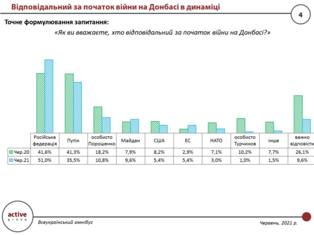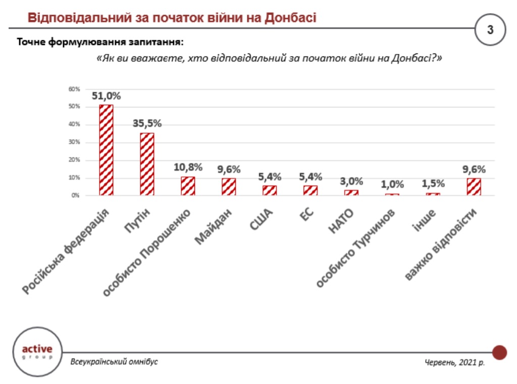 Відповідаючи на запитання «Як ви вважаєте, хто відповідальний за початок війни на Донбасі?», 51% респондентів назвали Російську Федерацію, 35,5% – Путіна, 10,8% опитаних назвали колишнього президента Порошенка, 9,6% – Майдан, по 5,4% – США та ЄС, 3% – НАТО, 1% – особисто Турчинова. Не визначилися з відповіддю 9,6% опитаних, а 1,5% обрали відповідь «Інше».