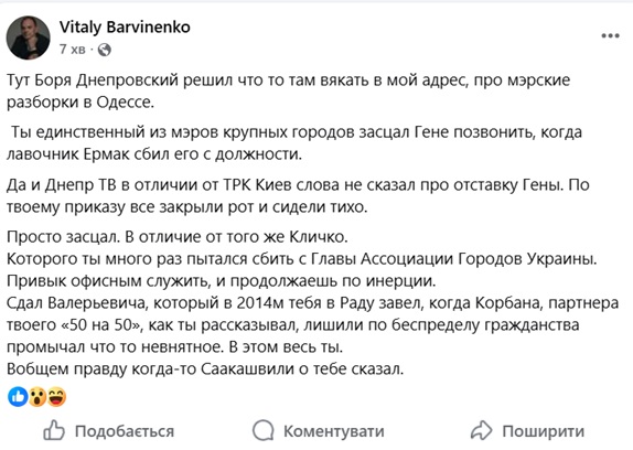 " Барвіненко, ти - пи.диш. Ви свої мерські розбірки залишіть собі й мене не вплутуйте. Я ніде не казав, що Кіпер допомагає мені електротранспортом. Ті свідомо, нахабно брешеш. Кіпер як й десятки інших посадовців, зателефонував й запропонував допомогу. Наприклад ремонтними бригадами й попросив у разі наступного обстрілу, допомогти Одесі від Дніпра. Нормальна людська розмова", - написав мер.