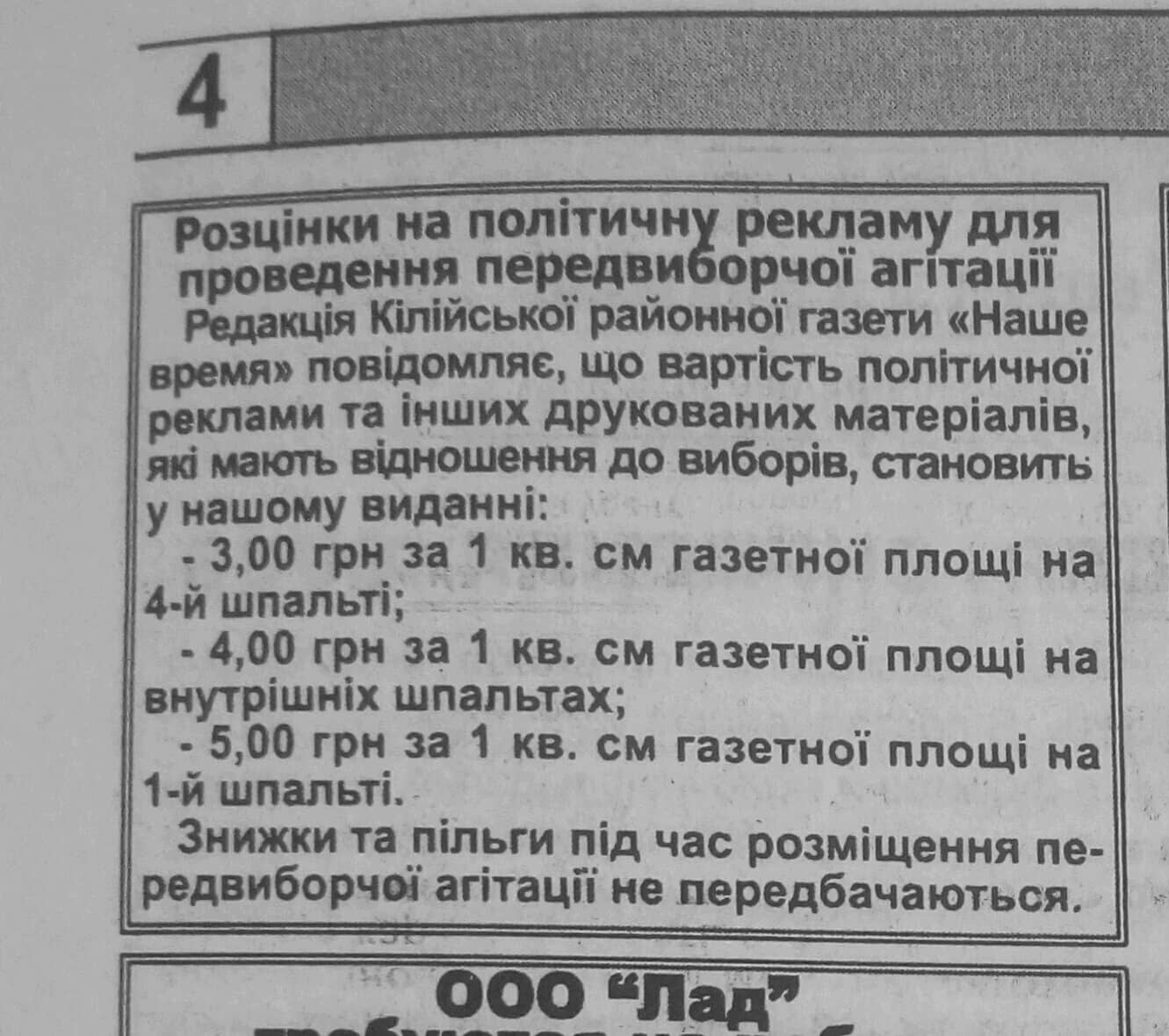 Изучив местные СМИ, мы увидели, что аграрии свои агитационные материалы размещала только в этой газете. Однако, по нашим подсчетам (сравнив площадь и расценки) получается, что на публикацию материалов потрачено было немногим больше 13 тыс. грн.