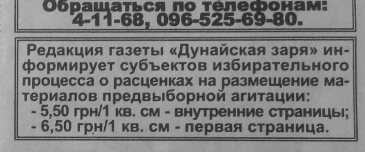 Согласно расценкам на политическую рекламу, для проведения предвыборной агитации один квадратный сантиметр газетной площади в коммунальной газете на первой полосе стоил 5 грн, на второй и третьей – 4 грн. Квадратный сантиметр в «Дунайской заре» на 1 полосе стоил 6 грн 50 коп, внутри – 5 грн 50 коп.
