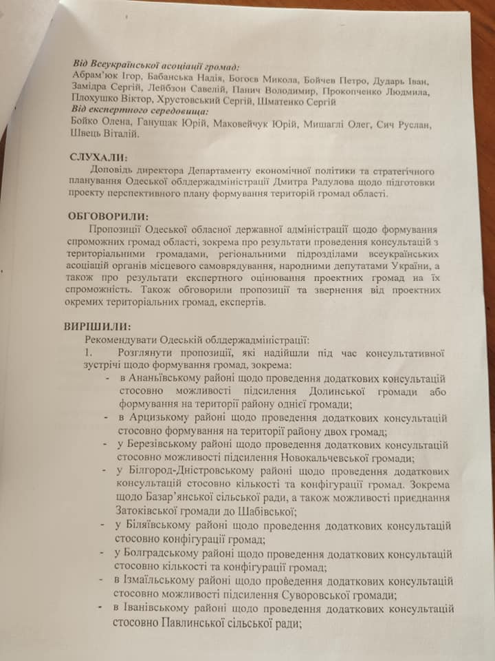 Про це йдеться у протоколі консультативної зустрічі, щодо перспективного плану формування територій громад регіону.