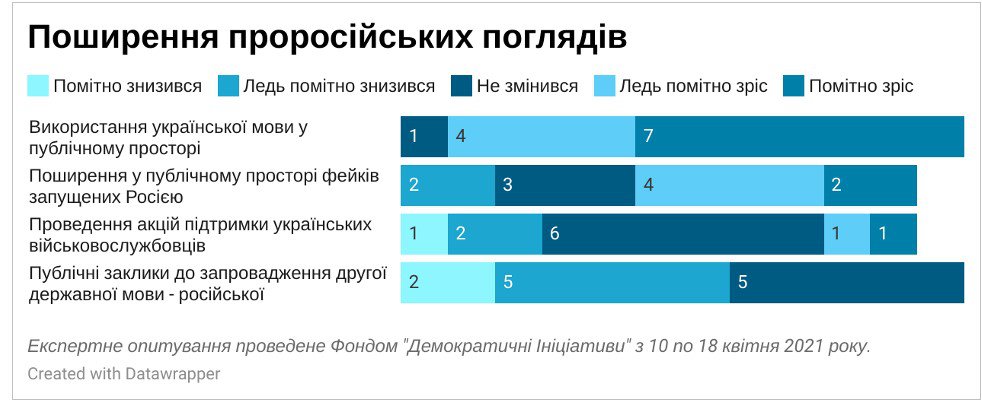 Після місцевих виборів у Одеській області (жовтень 2020-го) експерти відзначають зростання використання української мови у публічному просторі та зниження закликів до запровадження російської мови як другої державної. Водночас трохи помітнішим стало поширення наративів «русского міра».