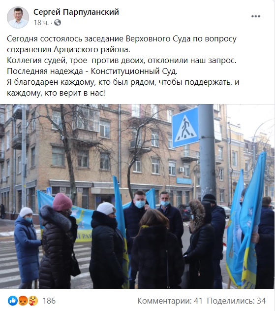"Відбулося засідання Верховного Суду з питання збереження Арцизького району. Колегія суддів, троє проти двох, відхилили наш запит. Остання надія - Конституційний суд", - написав він.