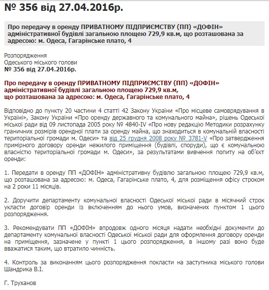 27 апреля 2016 года городской голова Одессы Геннадий Труханов подписал распоряжение «О передаче в аренду частному предприятию «Дофин» административного здания общей площадью 729,9 квадратных метра, расположенного по адресу: Одесса, Гагаринское плато, 4».