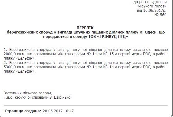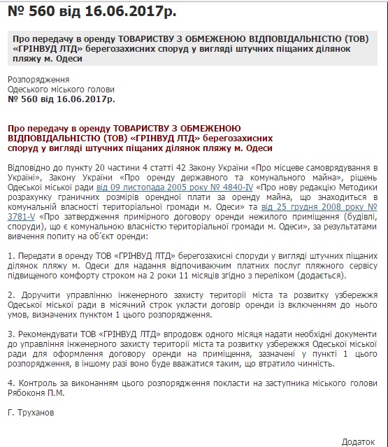 Городской голова Одессы Геннадий Труханов подписал распоряжение о передаче в аренду ООО «Гринвуд ЛТД» берегозащитных сооружений в виде искусственных песчаных участков пляжа.