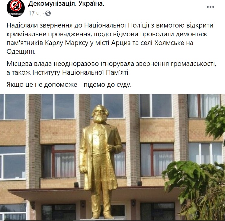 Активісти організації "Декомунізація. Україна" зверненулися до Національної поліції з вимогою відкрити кримінальне провадження, щодо відмови проводити демонтаж пам'ятників Карлу Марксу у місті Арциз та селі Холмське на Одещині.