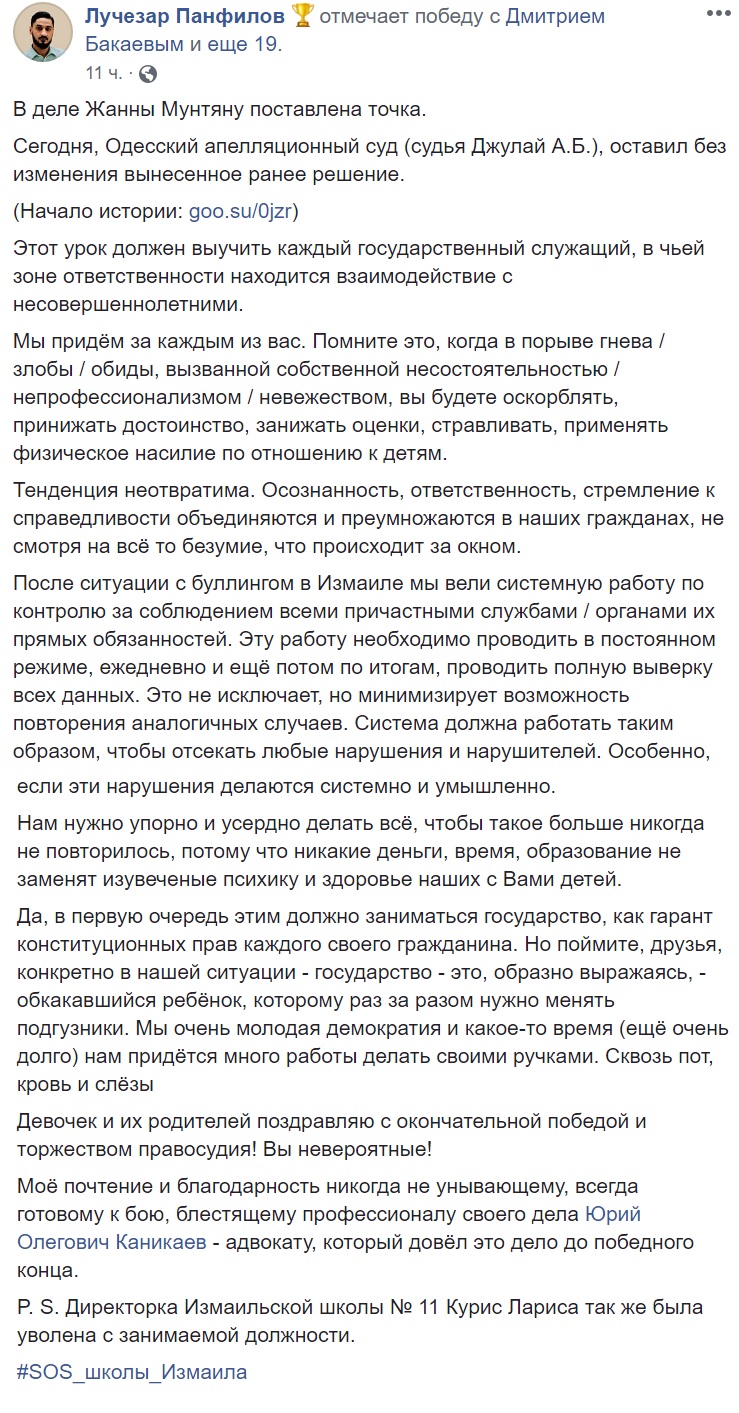 В березні Ізмаїльский суд визнав вчительку Ізмаїльської школи №11 винною в буллінгу і оштрафував на 1 тис 360 гривень, однак тоді повідомляли, що вона продовжує працювати в навчальному закладі бо звільнити її могла лише директорка. Наразі і сама директорка тієї школи Лариса Куріс звільнена з посади саме через той випадок.