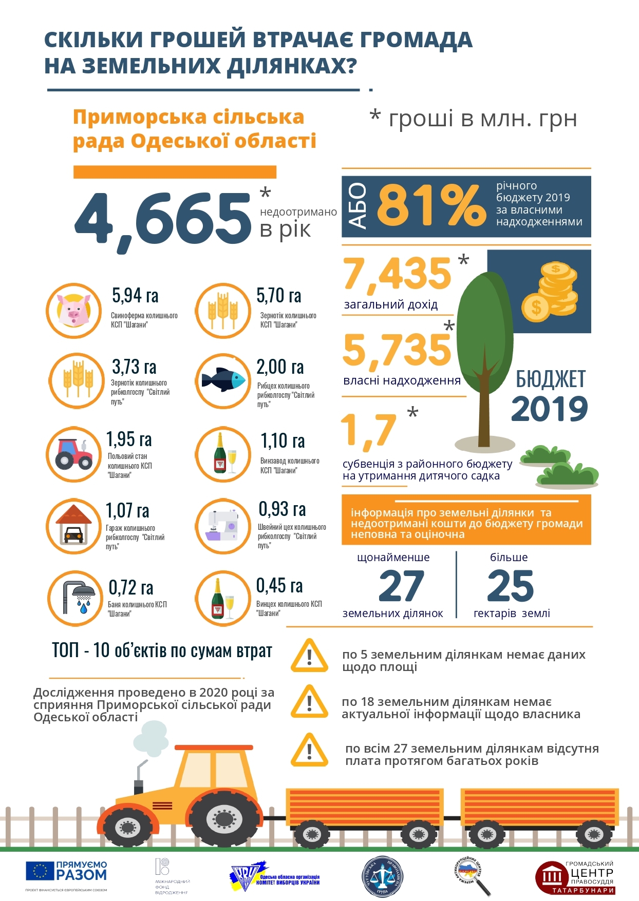 Громадський центр правосуддя та Приморська сільська рада Татарбунарського району Одеської області провели початкову інвентаризацію використання нерухомого майна та земельних ділянок та виявили значне недоотримання коштів до місцевого бюджету щодо орендних платежів, земельного податку та інших зборів.