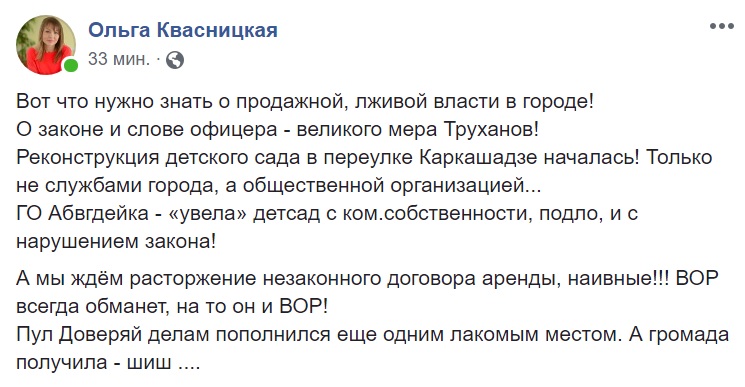 «Реконструкція дитячого садка в провулку Каркашадзе почалася! Тільки не службами міста, а громадською організацією. «А-Б-В-Г-Дейка» - «поцупила» дитсадок з комунальної власності, підло, і з порушенням закону!», - написала депутат на сторінці в Facebook.
