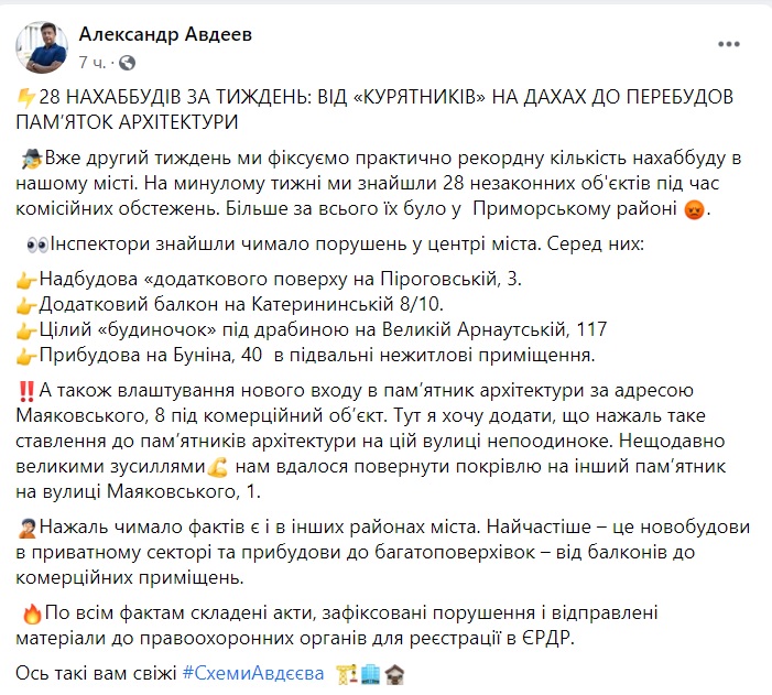 «На жаль таке ставлення до пам’яток архітектури на цій вулиці непоодиноке. Нещодавно великими зусиллями нам вдалося повернути покрівлю на інший пам’ятник на провулку Маяковського, 1. Нажаль чимало фактів є і в інших районах міста. Найчастіше – це новобудови в приватному секторі та прибудови до багатоповерхівок – від балконів до комерційних приміщень.По всім фактам складені акти, зафіксовані порушення і відправлені матеріали до правоохоронних органів для реєстрації в ЄРДР», - повідомив посадовець.