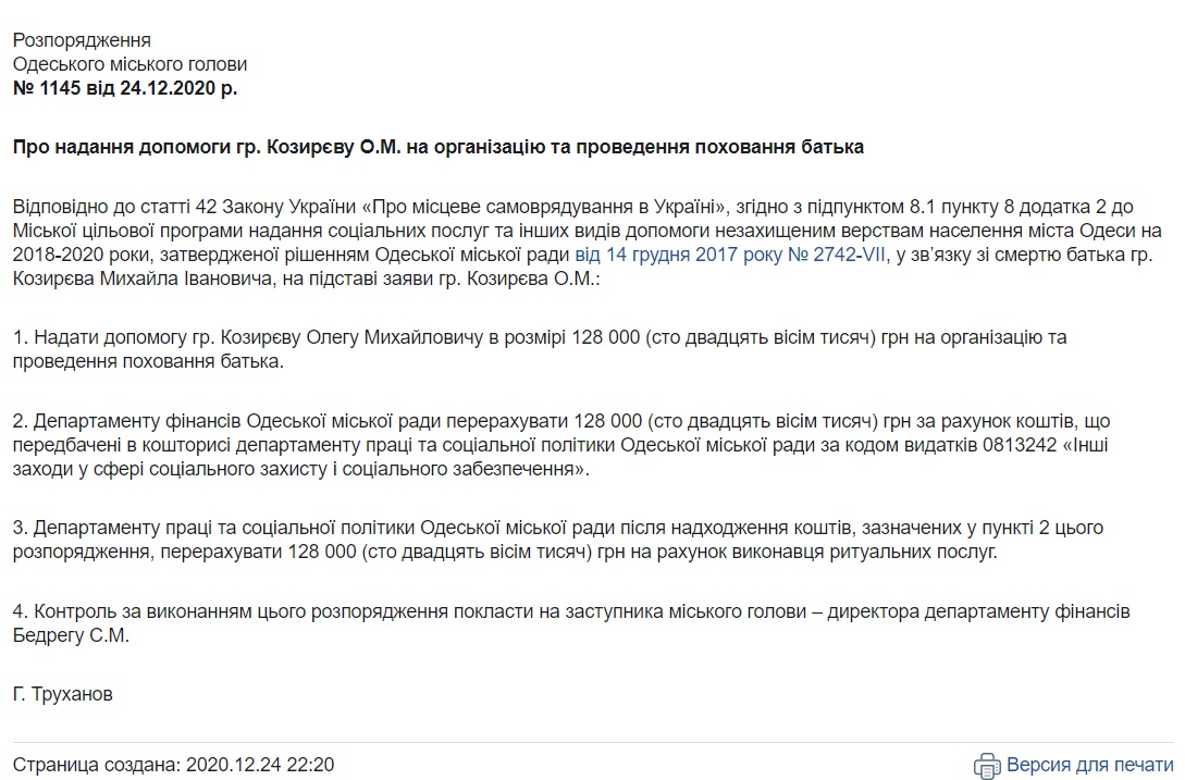 Одеський міський голова Геннадій Труханов підписав розпорядження про виділення про надання допомоги Олегу Козирєву на організацію та проведення поховання батька.