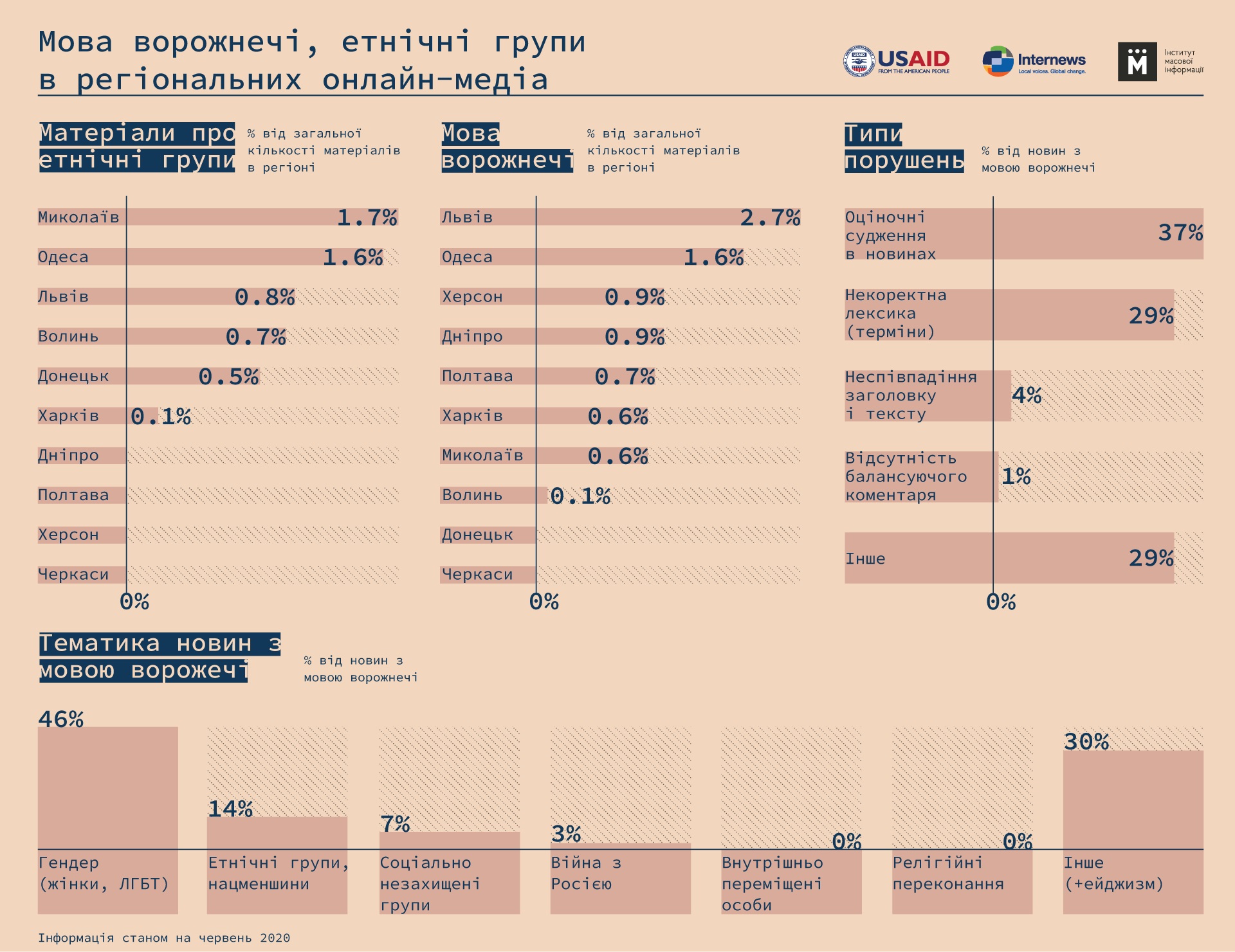 Зокрема за результатами моніторингу, найбільше про національні меншини чи етнічні групи писали онлайн-ЗМІ Миколаєва (1,7% загальної кількості публікацій в регіоні), Одеси (1,6%) і Львова (0,8%). Водночас найбільше випадків мови ворожнечі в цій та інших тематиках було зафіксовано в онлайн-ЗМІ Львова (2,7% загальної кількості публікацій у регіоні) та Одеси (1,6%). Не використовували мови ворожнечі в аналізований період онлайн-ЗМІ Донецька і Черкас.