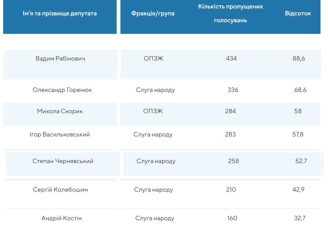 Як зазначає ОПОРА, Найбільше голосувань пропустив нардеп Віталій Данілов ("Батьківщина") — 100%. Андрій Деркач (позафракційний) та Вадим Столар (ОПЗЖ) не відвідали 96,1% та 94,3% голосувань відповідно.