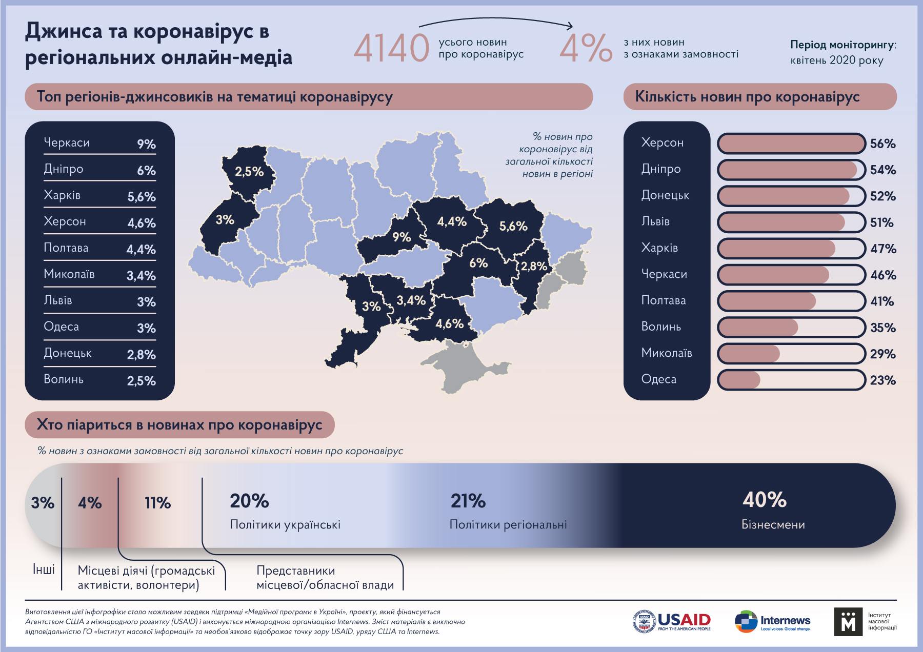 За результатами моніторингу, представники місцевої та обласної влади виступали спікерами в 25% новин, українські політики – в 14%, медичні працівники – в 7% публікацій про коронавірус.