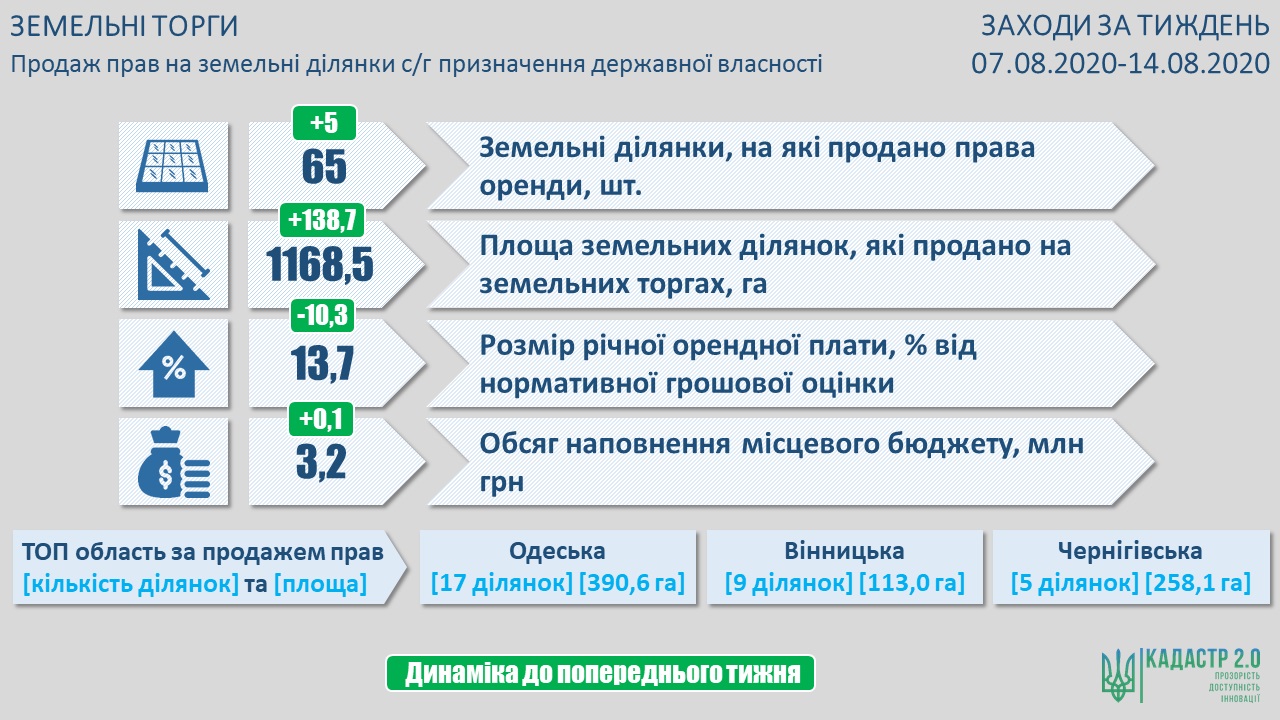 За період з 7 по 14 серпня в Україні продали права оренди на 65 земельних ділянок загальною площею 1 тис 168,52 га і лідером стала Одеська область, де продали права оренди на 17 земельних ділянок загальною площею 390,69 га.