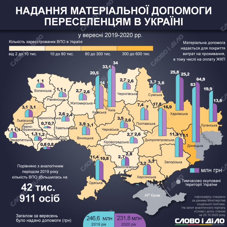 У вересні держава виплатила внутрішньо переміщеним особам 231,8 млн грн матеріальної допомоги, що надається для покриття витрат на проживання та на оплату житлово-комунальних послуг. У вересні 2019 року ця сума становила 246,6 млн.