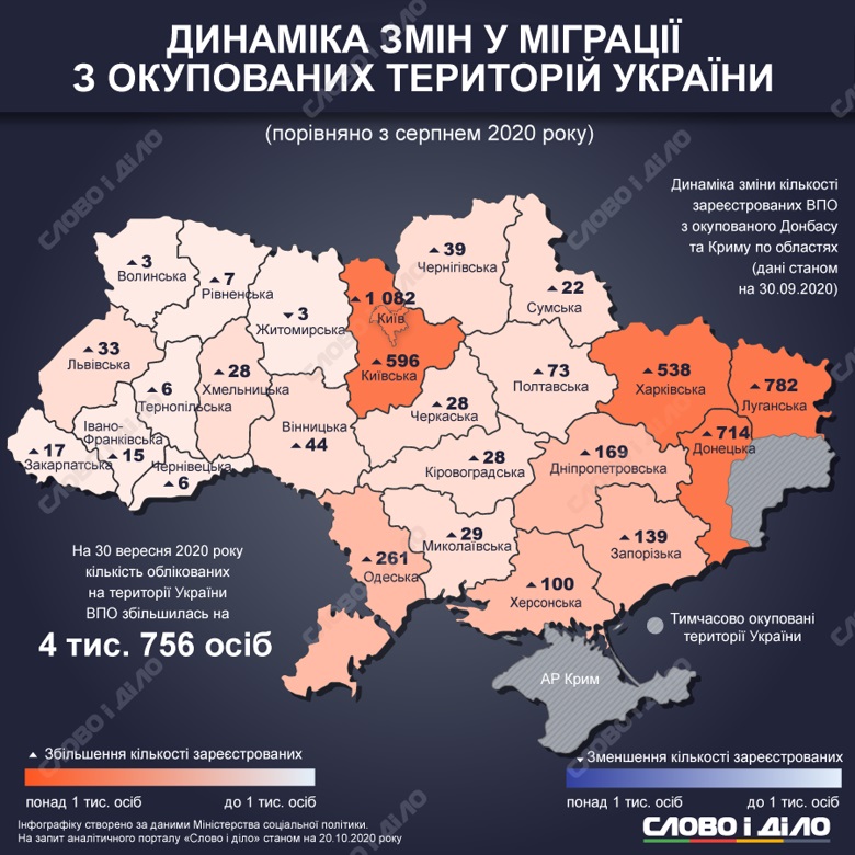Кількість зареєстрованих переселенців в Україні за місяць збільшилася на 4 тисячі 756 осіб, а загалом станом на 30 вересня порівняно з періодом на 30 вересня 2019 року - на 42 тисячі 911 осіб.
