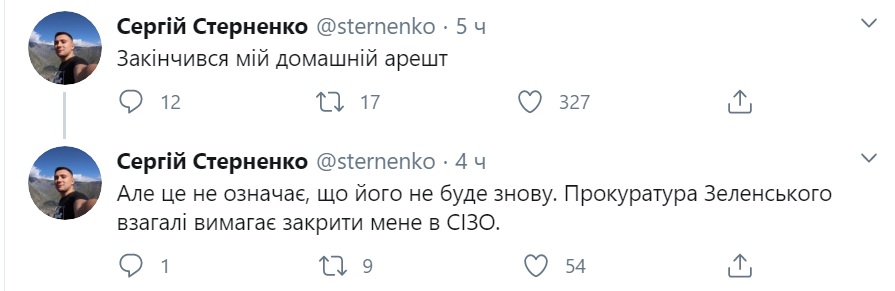 Активіст Сергій Стерненко, якого обвинувачують у вбивстві, повідомив, що термін запобіжного заходу щодо нього сплинув, але зазначив, що чекає від прокуратури клопотання про обрання йому запобіжного заходу у вигляді тримання під вартою.