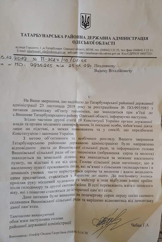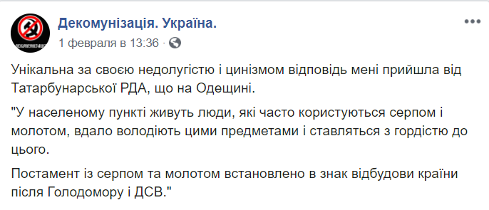 "Унікальна за своєю недолугістю і цинізмом відповідь мені прийшла від Татарбунарської РДА, що на Одещині", - пише автор допису. У самій відповіді, яку надіслали чиновниик Позднякову, йдеться про те, що жителі села у повсякденні постійно користуються серпом та молотом і з повагою ставляться до цих знарядь праці. Крім того, свою відмову в РДА мотивують тим, що до постаменту колись свою руку приклав місцевий художник та майстер "в знак відбудови нашої країни після голодомору та Другої світової війни". А літні люди, які складають найбільшу кількість жителів села, з повагою ставляться до історичної пам'яті.