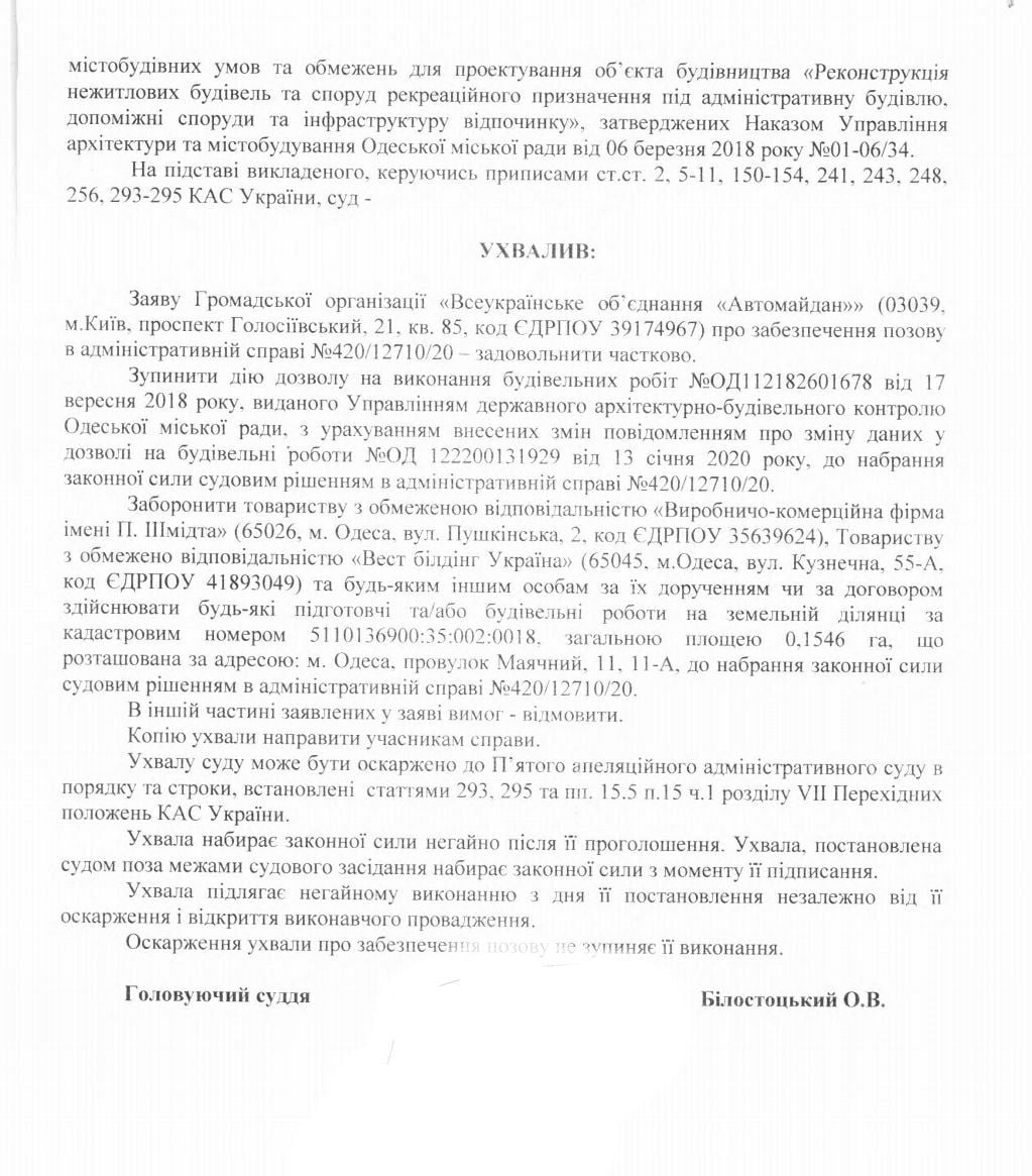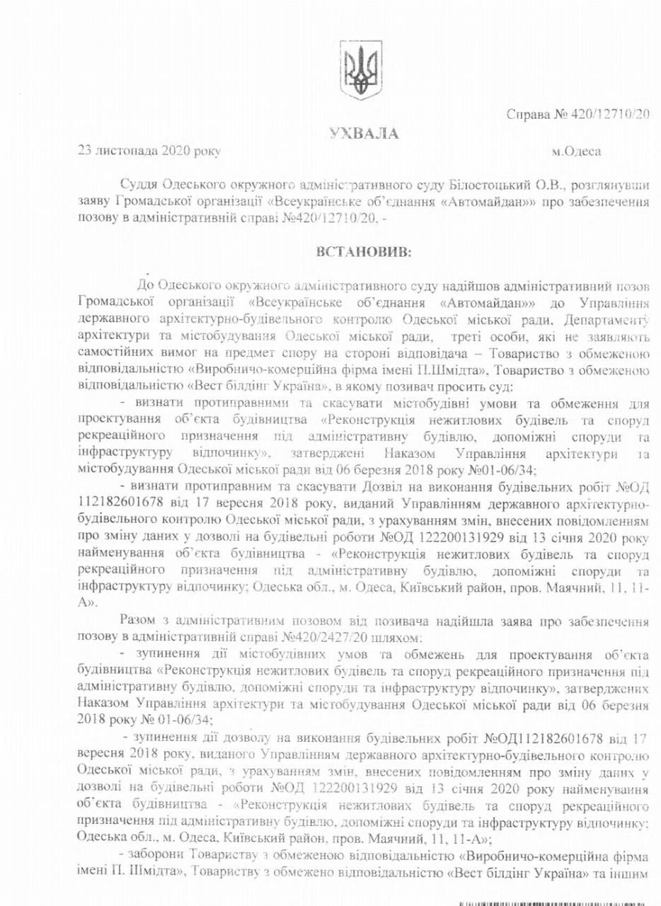 Зокрема, суд зупинив дію дозволу на виконання будівельних робіт від 17 вересня 2018 року, виданого Управлінням державного архітектурно-будівельного контролю Одеської міської ради.