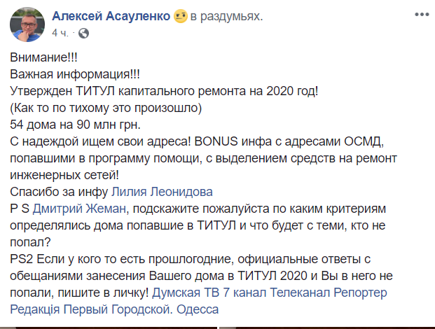 «Затверджений Титул капітального ремонту на 2020 рік», - написав він та додав, що якось по тихому це сталося.