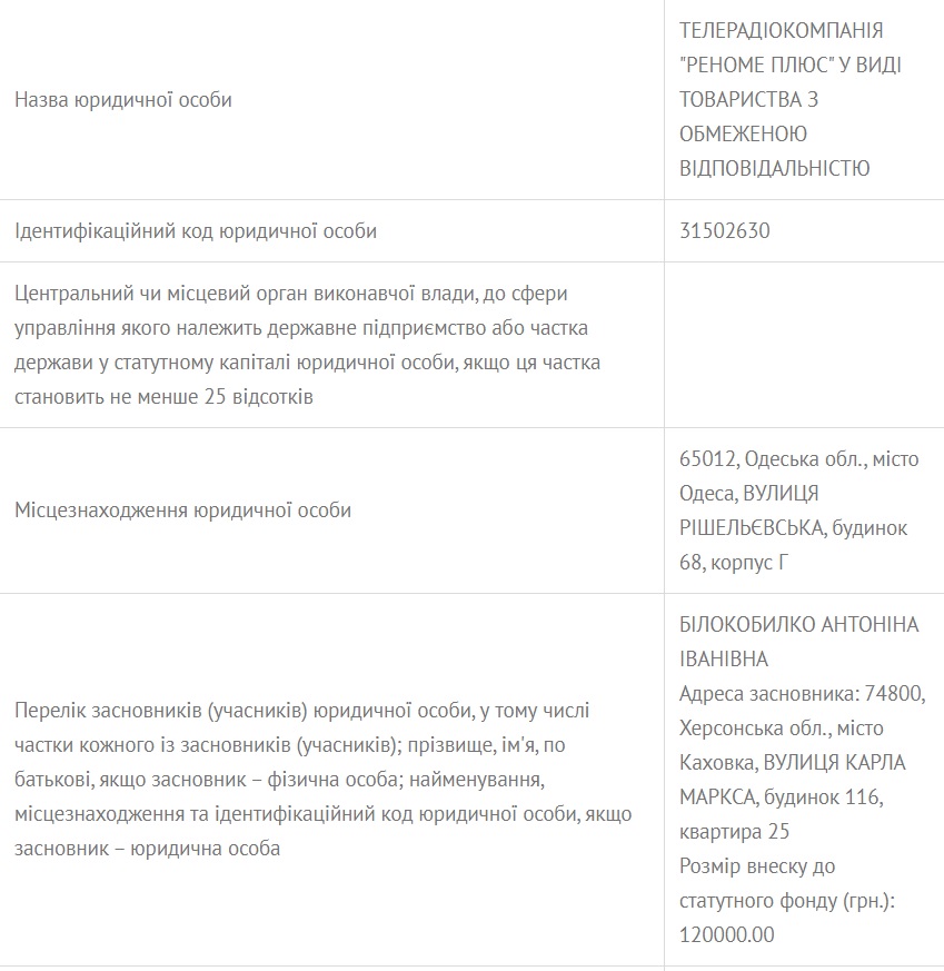 Згідно з єдиним реєстром юридичних осіб, фізичних осіб підприємців та громадських формувань, засновником ТОВ «Телерадіокомпанія «Реноме плюс» є Антоніна Білокобилко, членкіня правління Українського фінансово-кредитного альянсу, а директором - Ольга Азарова - дружина засновника кредитної спілки Андрія Азарова засновника групи компаній «AZAROV GROUP», в яку входить медіахолдинг «100%».
