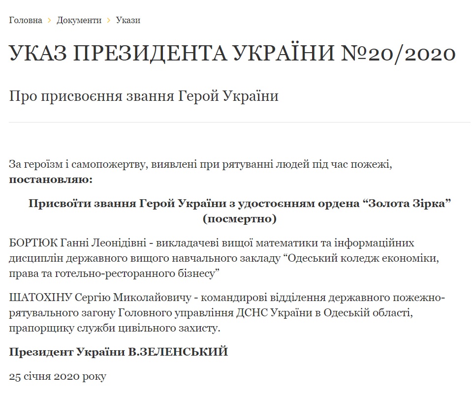 Викладачка вищої математики та інформаційних дисциплін Ганна Бортюк і рятувальник Сергій Шатохін, які загинули під час пожежі в Одеському коледжі, посмертно удостоєні звання Героїв України.
