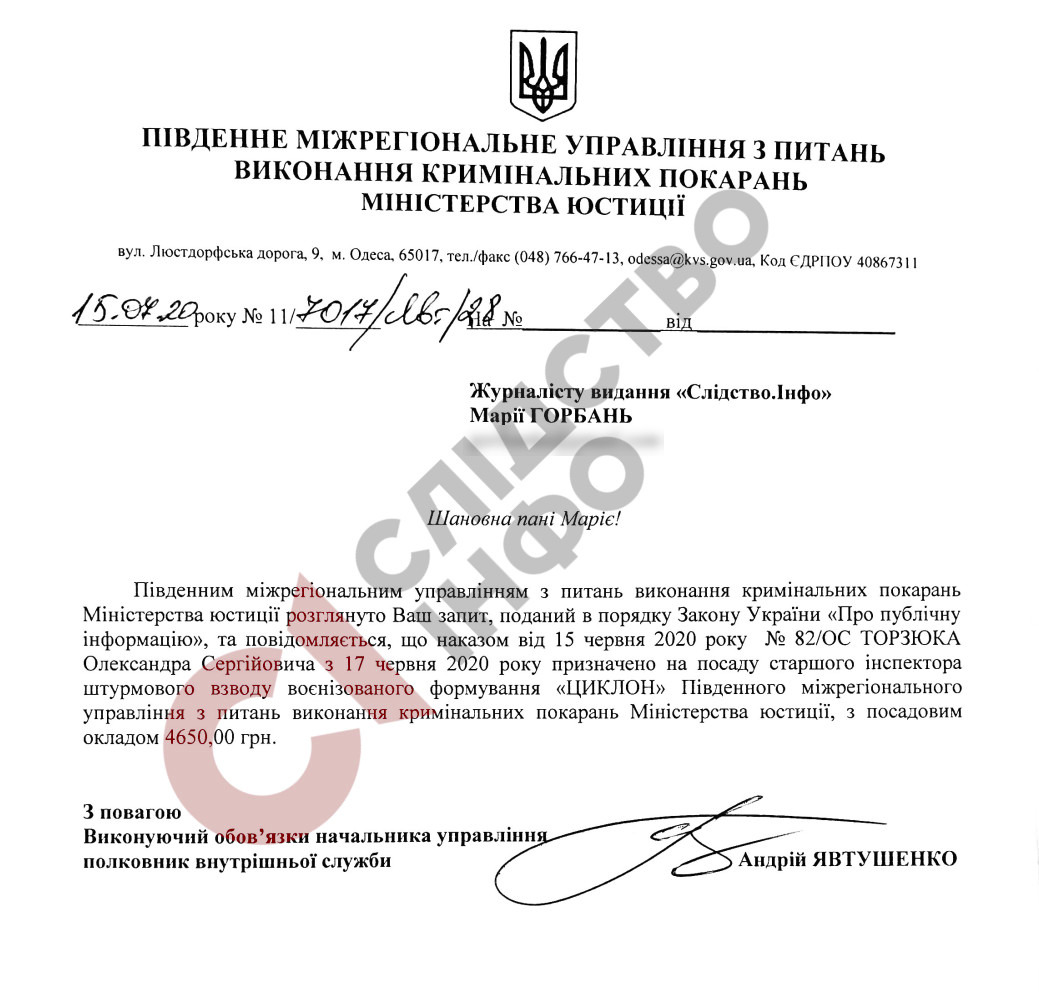 «…Торзюка Олександра Сергійовича з 17 червня 2020 року призначено на посаду старшого інспектора штурмового взводу воєнізованого формування «Циклон» Південного міжрегіонального управління з питань виконання кримінальних покарань Міністерства юстиції», — йдеться у відповіді.