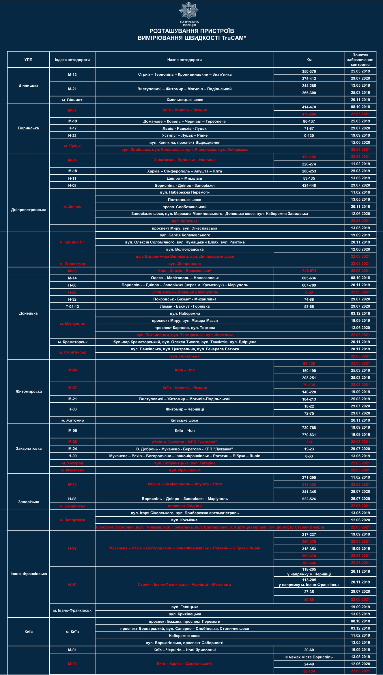 Усього на дорогах України працюватиме 117 приладів TruCAM, а вимірювання здійснюватиметься на 309 ділянках.