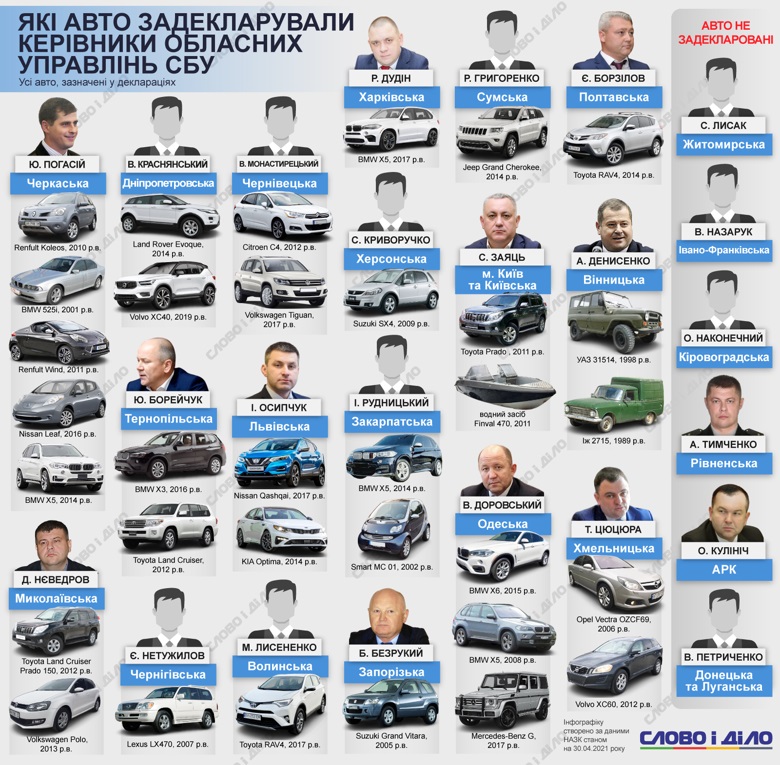 Також є керівники регіональних управлінь СБУ, які не задекларували жодної автівки ‒ це начальник управління Служби безпеки в Донецькій та Луганській областях Володимир Петриченко, у Житомирській області Сергій Лисак, в АРК Олег Кулініч та у Рівненській області Андрій Тимченко.