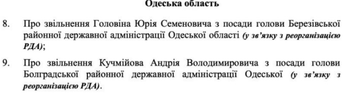 У документі сказано, що Юрія Головіна та Андрія Кучмійова звільнили через реорганізацію районних державних адміністрацій.