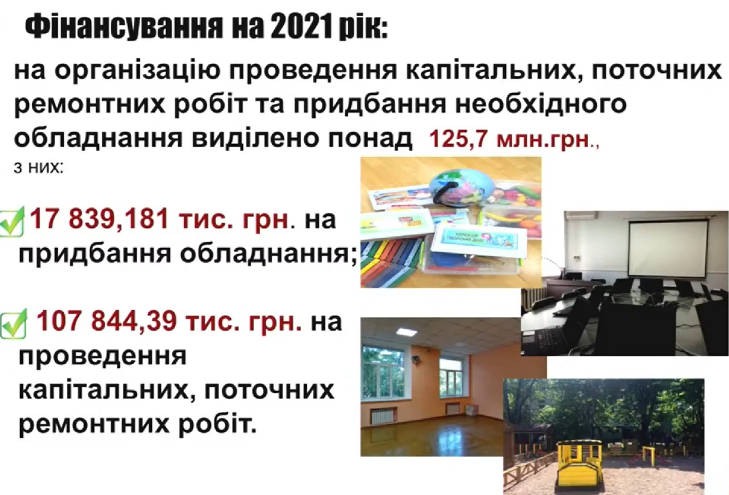 Загалом, за даними департаменту, цього року муніципалітет витратив на підготовку шкіл міста до навчального року 125,7 мільйонів гривень. З них 108 мільйонів 844 тисячі витратили на капітальні ремонти, а 17 мільйонів 839,3 тисяч на придбання обладнання.