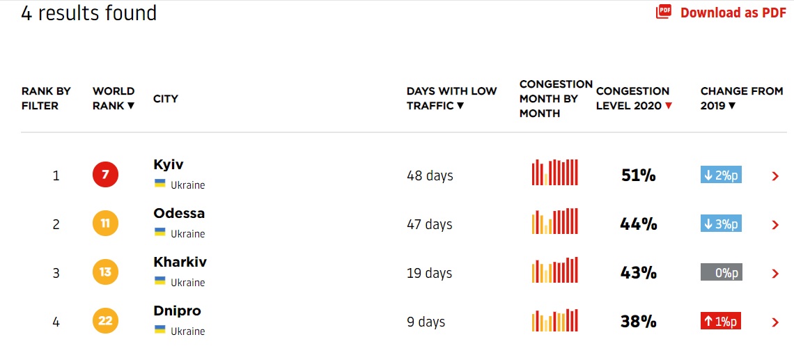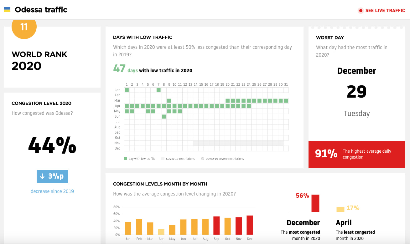 Втім, якщо минулого року дороги міста були завантажені на 47%, то в 2020 на 44%. За цим показником в Україні Одеса поступається лише Києву, де шляхи завантажені на 51%, а в 2019 році спостерігалося завантаження на 53%. Втім, у 2019 році столиця займала 12 місце, а за результатами 2020 року - сьоме.