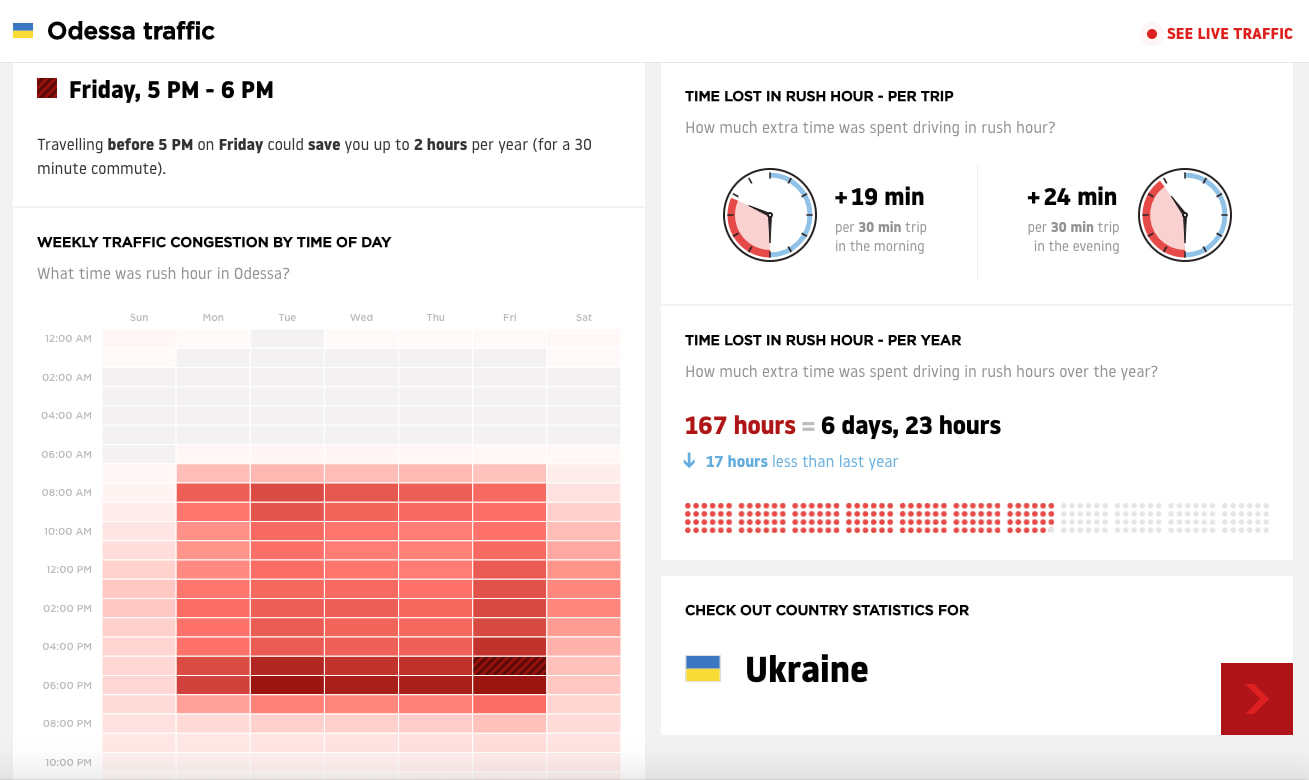 Індекс Одеси 44% означає, що через пробки поїздка займає на 44% більше часу, ніж могла б. Тобто у годину-пік одесити витрачають на дорогу на 19 хвилин більше, ніж могли б, а в вечері на 24 хвилини. Найбільші затори в п'ятницю ввечері.