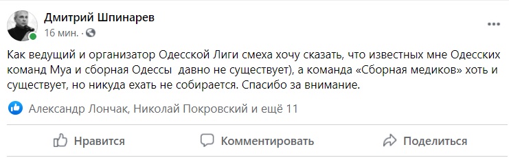 "Як ведучий і організатор Одеської Ліги сміху хочу сказати, що відомих мені Одеських команд Муа і Збірна Одеси давно не існує), а команда «Збірна медиків» хоч і існує, але нікуди їхати не збирається", - написав він на своїй сторінці у Facebook.