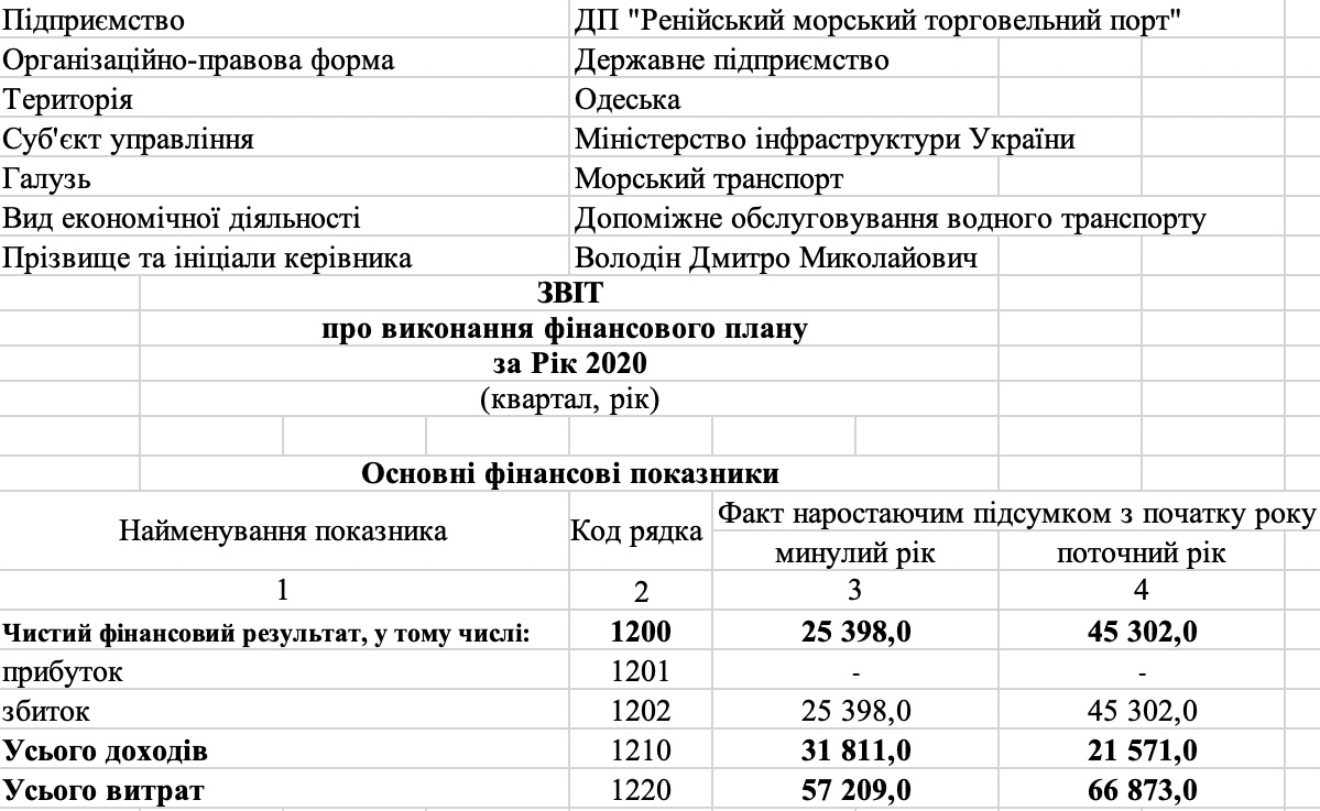 "Ренійський морський торговельний порт" у 2020 році відпрацював із чистим збитком у 45,3 мільйонів гривень, а прострочена кредиторська заборгованість Ренійського порту зросла до 100 мільйонів.