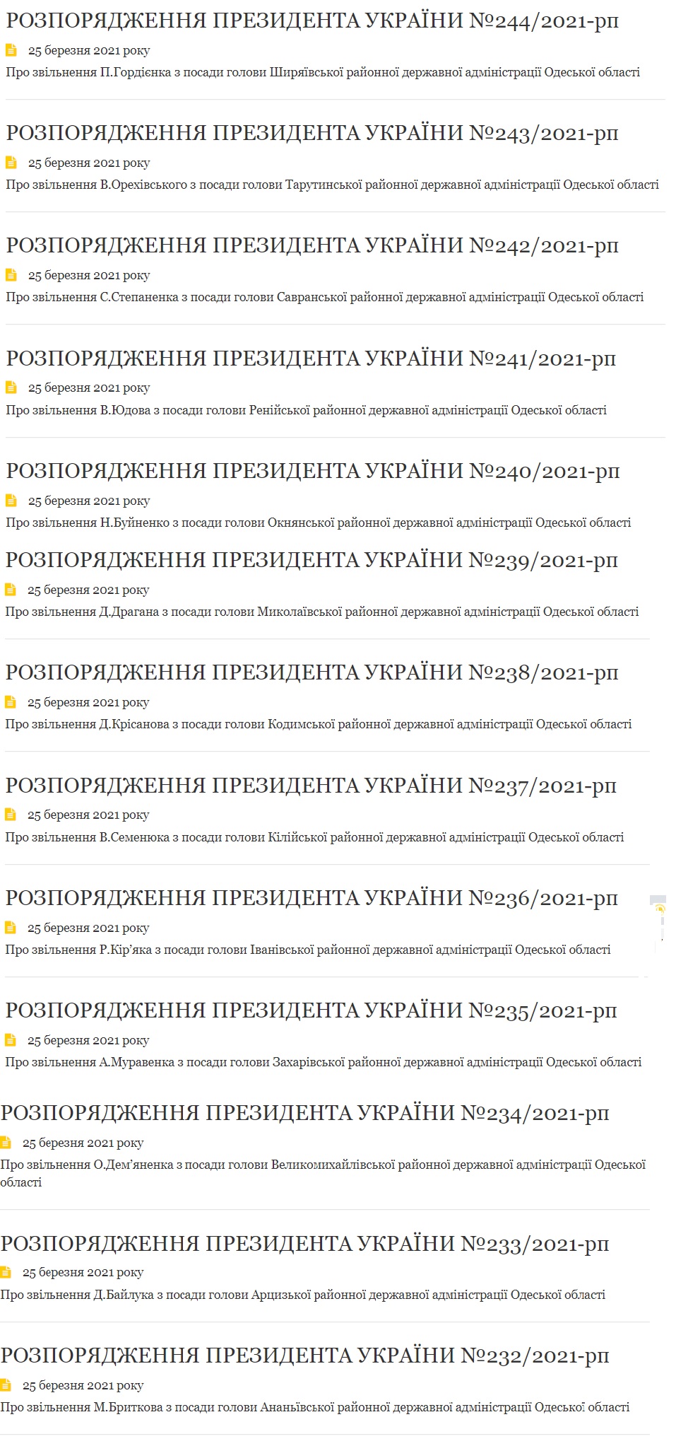 Згідно з документами, звільнені голови Ширяївської, Тарутинської, Савранської, Ренійської, Окнянскої, Миколаївської, Кодимської, Кілійської, Іванівської, Захарівської, Великомихайлівської, Арцизької, Ананьївської районних державних адміністрацій Одеської області.