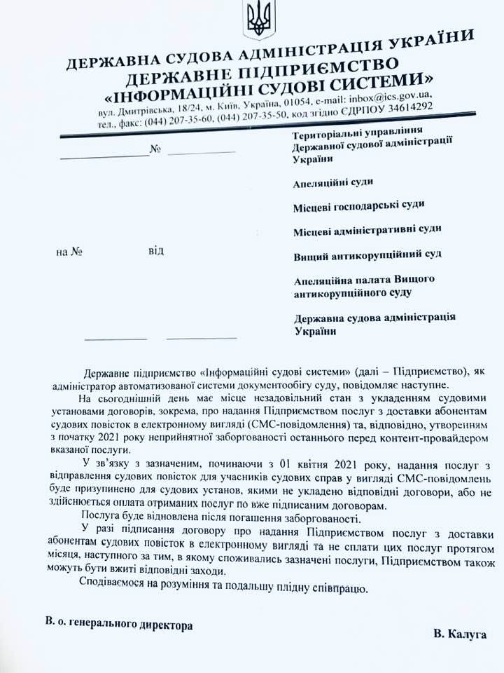 Отже підприємство направило лист судам України із попередженням про те, що починаючи з 1 квітня надання послуг з відправлення судових повісток для учасників судових справ у вигляді SMS-повідомлень буде призупинено для судових установ, якими не укладено відповідні договори або не здійснюється оплата отриманих послуг по вже підписаним договорам.