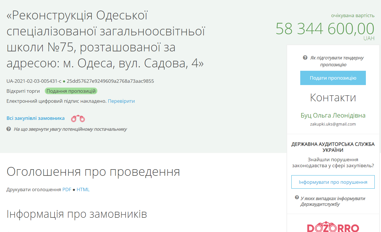 У системі електронних закупівель Prozorro зазначено, що на реконструкцію школи буде виділено 58 млн 344 тис. 600 гривень. Початок аукціону відбудеться 22 лютого, закінчити роботи підрядник зобов'язаний до 31 грудня 2022 року.