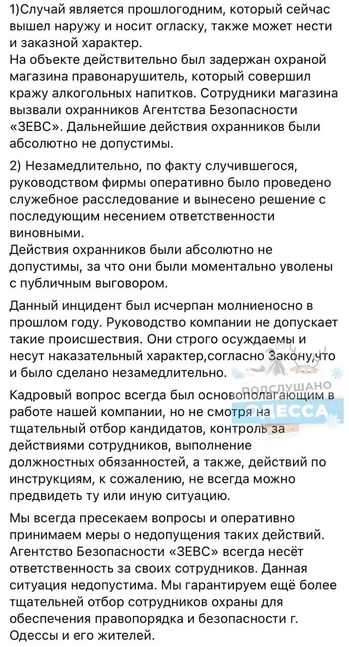 Це не перший випадок, коли це охоронне агентство опиняється у центрі гучного скандалу. Так, в червні 2017 року агентство безпеки "Зевс" змушене було вибачатися перед журналістами і жителями Одеси за інцидент з недопуском громадян в будівлю Одеської міської ради під час сесії.