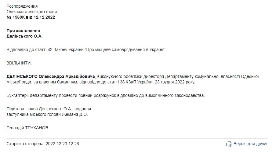 Одеський міський голова Геннадій Труханов, розпорядився звільнити з посади тимчасово виконувача обов'язки директора департаменту комунальної власності Одеської міської ради Олександра Делінського.