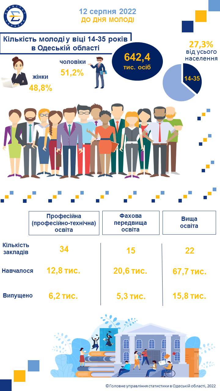 За останніми даними чисельність молоді Одеської області у віці від 14 до 35 років становила 642,4 тис. осіб, з них 51,2% – чоловіки, 48,8% – жінки. Питома вага молоді в загальній кількості постійного населення – 27,3%. Найчисельнішою є група у віці 30–35 років – 36,4% (233,7 тис. осіб).
