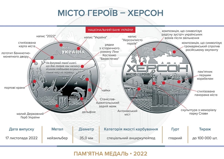 Зокрема 19 листопада на на центральній площі вільного Херсона, який ще зовсім недавно був під російською окупацією, відбулася презентація першої пам’ятної медалі із серії, присвяченої містам героїв, – "Херсон – місто героїв". Медаль виготовлена з нейзильберу. Таких планують викарбувати до 100 тисяч штук причому 50 тисяч вже у 2022 році.