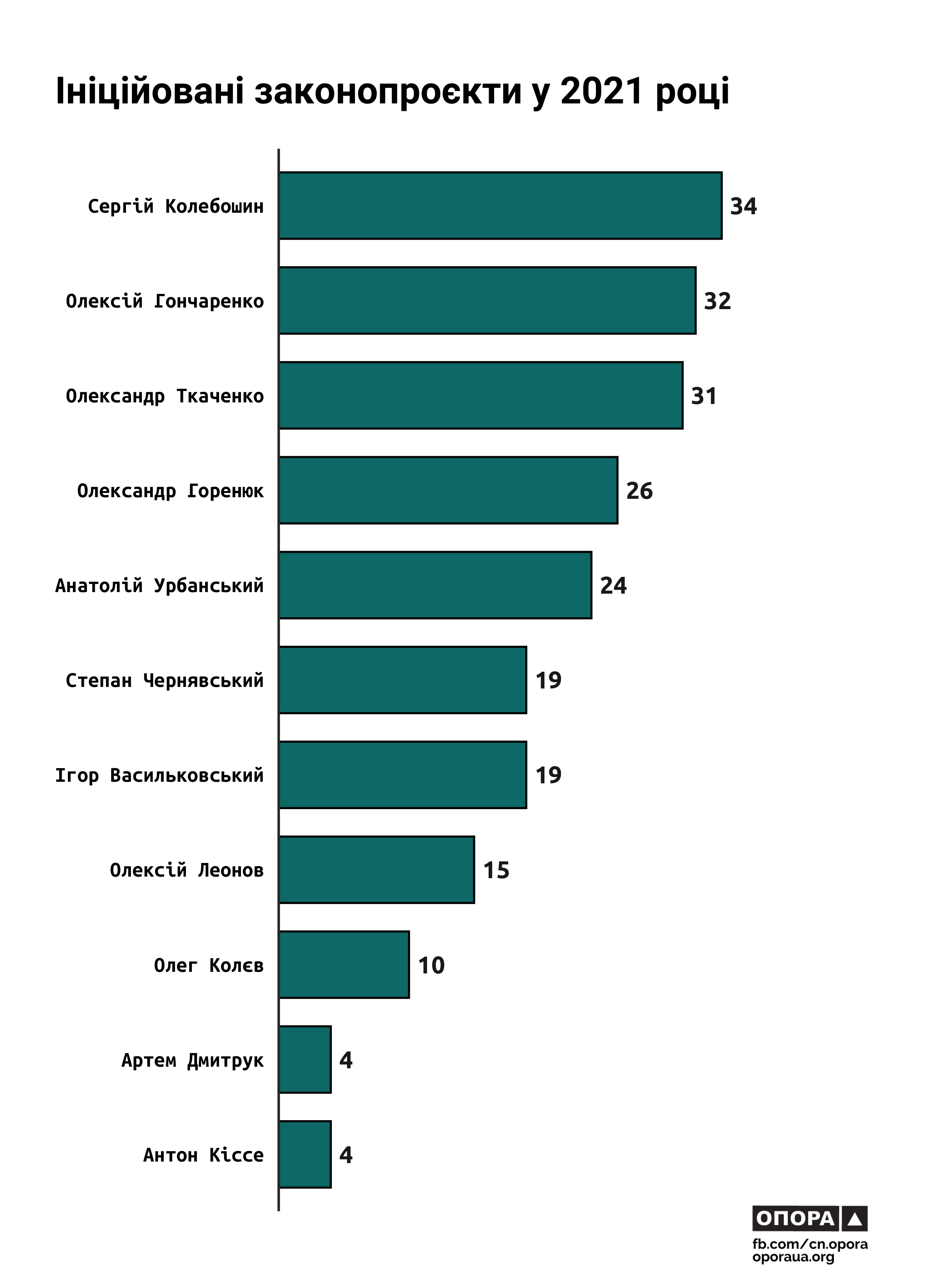 Лідером як за поданими законопроєктами (34), так і за затвердженими (10) у 2021 році серед одеських парламентарів є Сергій Колебошин.